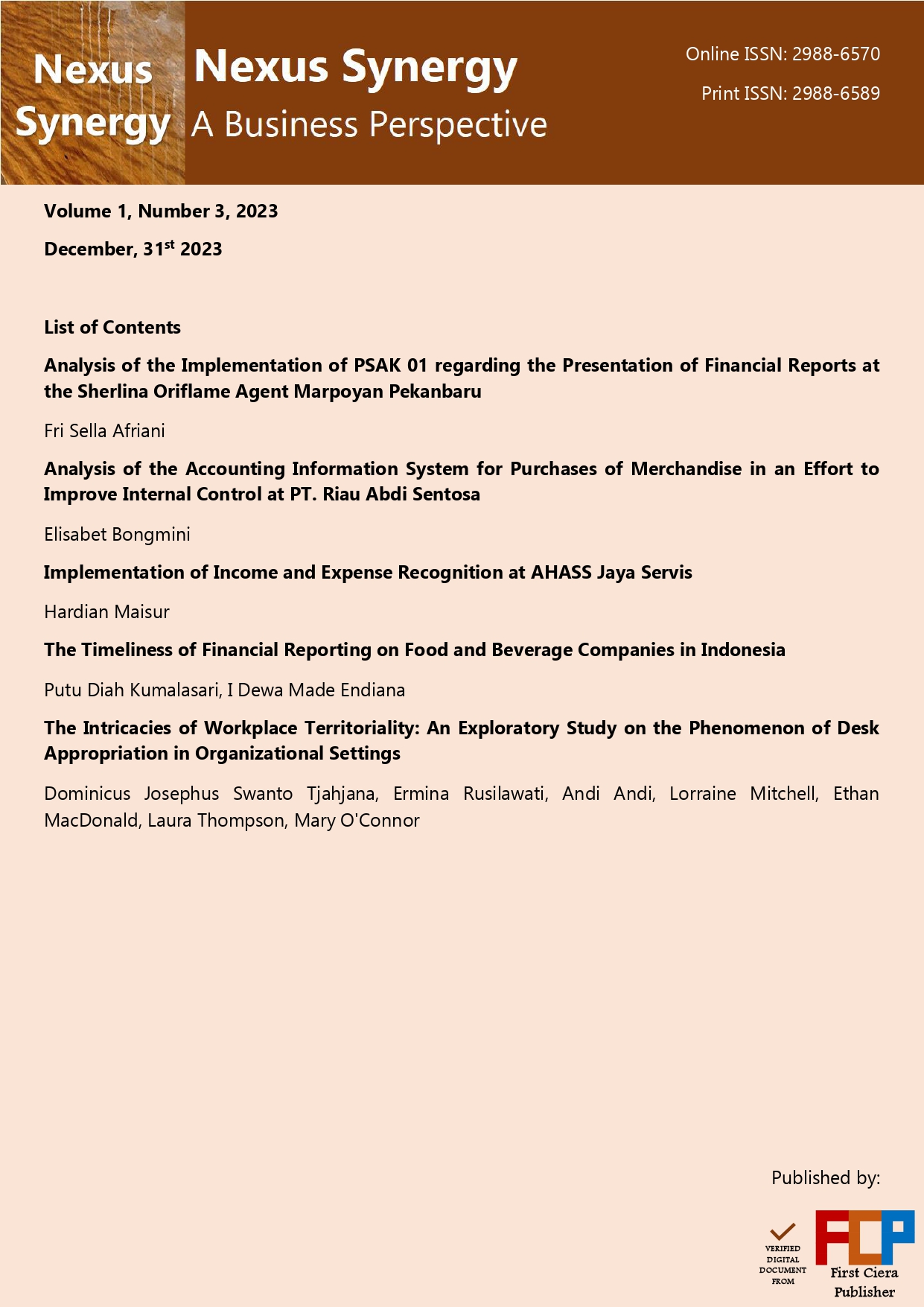 Afriani, F. S. (2023). Analysis of the Implementation of PSAK 01 regarding the Presentation of Financial Reports at the Sherlina Oriflame Agent Marpoyan Pekanbaru. Nexus Synergy: A Business Perspective, 1(3), 109–137. https://firstcierapublisher.com/index.php/nexus/article/view/55 DOI: https://doi.org/10.61230/nexus.v1i3.55